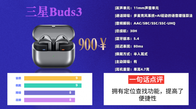 ②音质方面搭载11mm单个运转单位,互助1.5倍增强的功放振膜,支柱24bit/96kHz超高品性音频与SSC编解码器,可呈现灌音室般的高判辨度音频,低频塌实但不稠浊,中频东谈主声明晰通透,高频延展当然无逆耳感,三频眉目分明,适配流行、古典、播客等多种凝听场景。它与三 星树立深度适配,开盖即连、树立间切换飞速,可通过专属App自界说降噪强度、触控手势,非三 星树立也能好意思满使用蓝牙5.4一语气功能。