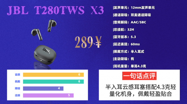 品牌8、J BL T 280TWS X3蓝牙耳机