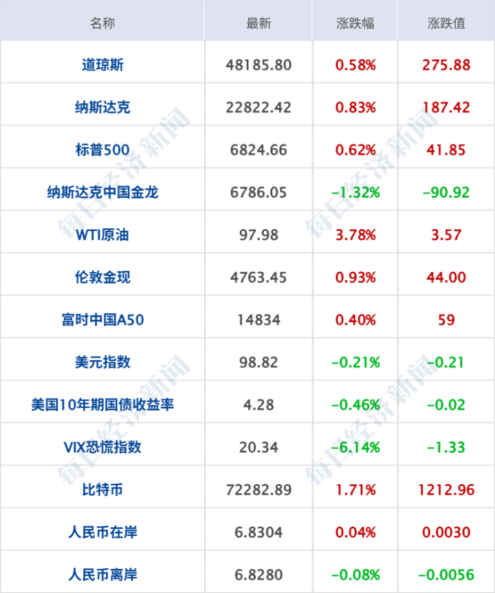 好意思股三大指数收盘集体收涨,纳指涨0.83%,标普500指数涨0.62%,说念指涨0.58%,其中,纳指、标普500指数录得七连涨;科技股普涨,闪迪涨超9%,亚马逊涨超5%,英特尔涨超4%,好意思光科技、应用材料涨超3%,奈飞、Meta、AMD涨超2%。中概股大都着落,纳斯达克中国金龙指数跌1.32%,蔚来、百度集团跌超4%,好当年跌逾3%,阿里巴巴、金山云涨逾1%,京东集团涨逾1%。