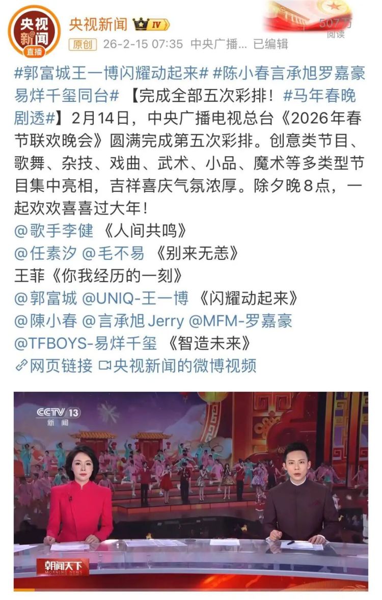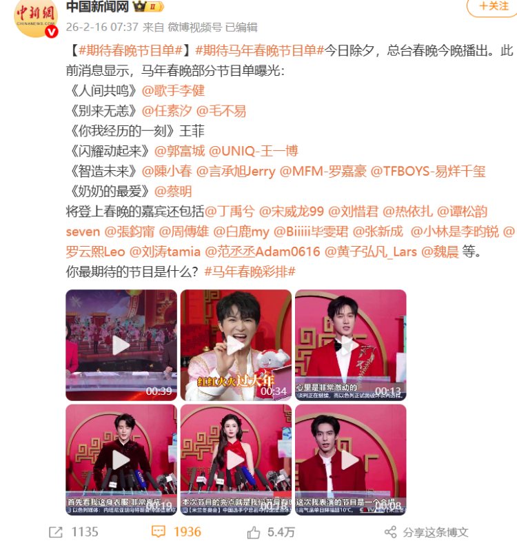 当天大除夕,总台春晚今晚播出。此前音书流露,马年春晚部分节目单曝光: