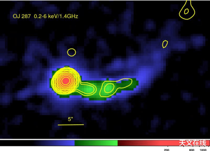一幅OJ287在耀发阶段的X射线与射电波段合成图像。图中在两个波段均可见的轨说念轨迹,示意了其中伴星黑洞的畅通。该系统是一个双超大质料黑洞系统,主黑洞质料约为180亿倍太阳质料,伴星黑洞质料约为1.5亿倍太阳质料。当二者最终并合时,将以引力波样子开释宽绰能量,其总能量可能与已知能量注入最高的星系团相配。 图片起头:A.P.Marscher与S.G.Jorstad,《天体物理学杂志》;NASA钱德拉X射线天文台与甚大阵列