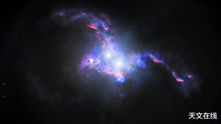 这张艺术家构思图展示了两个正在剧烈并合经过中的星系中枢内,两颗类星体所发出的耀目明后。尽管大多数星系仅领有一个超大质料黑洞,但在相配一部分星系中——尤其是处于早期演化阶段的星系——可能存在成对的超大质料黑洞。 图片起头:好意思国国度航空航天局(NASA)、欧洲航天局(ESA)及J.Olmsted(天外千里镜科学商议所,STScI)
