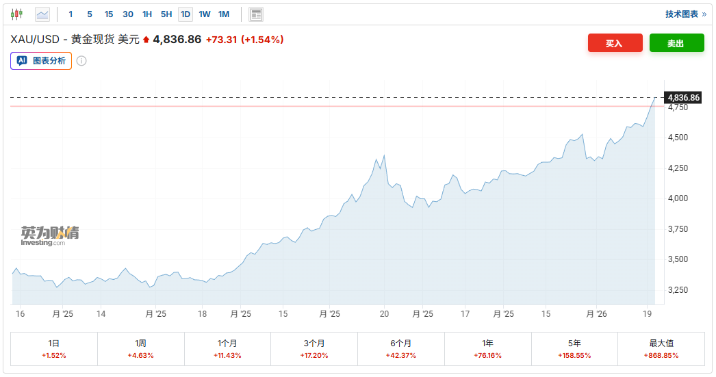 数据显示,黄金与白银在2025年实现惊人上涨后,进入2026年以后延续涨势并屡创新高。截至发稿,现货黄金涨1.55%,至4836.86美元/盎司,日内早些时候触及4844.39美元/盎司;现货白银则跌0.43%,至94.19美元/盎司,日内早些时候一度触及95.518美元/盎司。