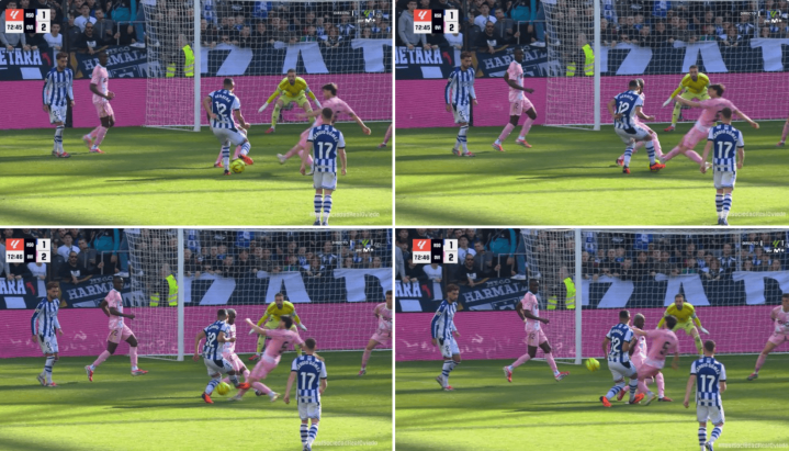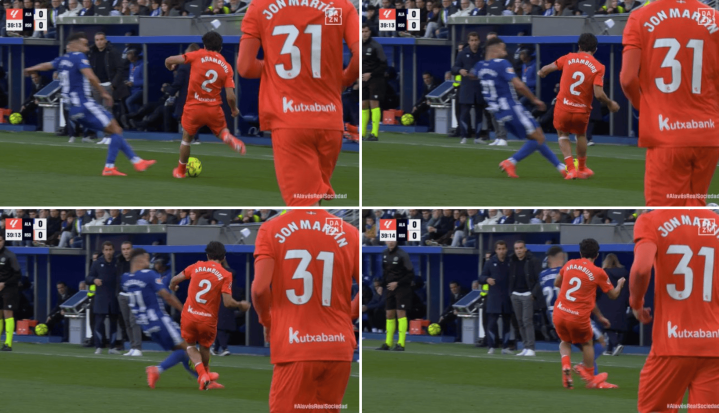 第二例发生在阿拉维斯对阵皇家社会比赛,阿兰布鲁在抢先突围后踩到对动作踝,裁判与VAR均未出示红牌。