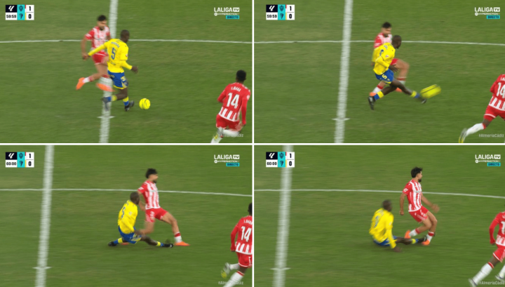 第三例为阿尔梅里亚对阵加的斯比赛,迪亚基特完成传球后因惯性变成对动作踝受力,UEDBETapp注册登录主裁致使速即讲解该动作不组成犯规。