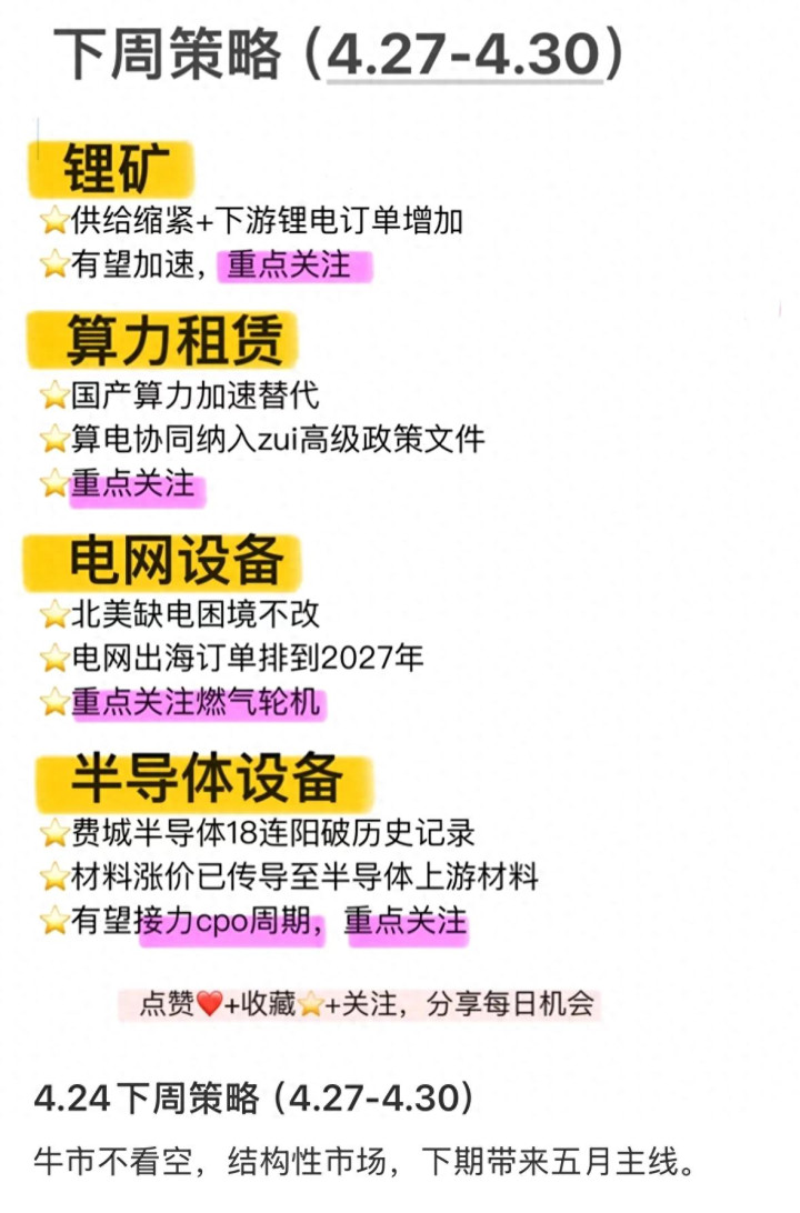 阛阓从来皆不是一成不变的,契机老是藏在变化里。之前各人皆追捧的赛说念,可能热度还是由去了;之前被忽略的所在,当今可能还是出现了新的契机。岂论是锂矿的供需回转,如故算力租出的国产替代,如故电网开辟的出海,大略半导体开辟的周期复苏,皆是产业趋势带来的契机,不是靠短期的音信炒作起来的。各人有什么不同样的看法,大略以为哪个赛说念的契机更大,皆不错在驳倒区聊聊,沿途交流一下。