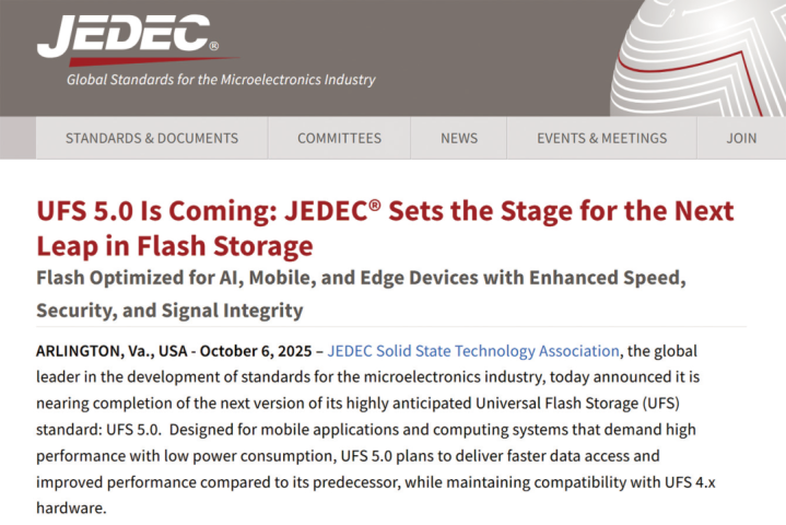 ▲JEDEC于2025年10月6日晓示新一代UFS 5.0法度行将登场