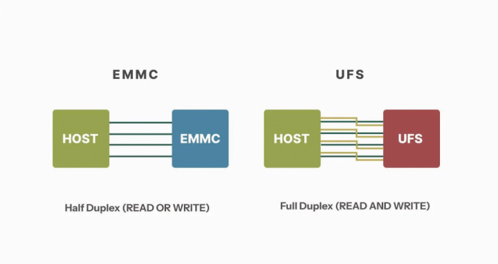 ▲UFS与eMMC存储架构对比透露图,展现了全双工与半双工责任形式的中枢相反。